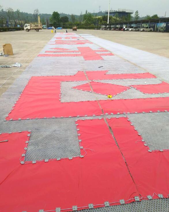白天大字醒目,夜晚大字发光,采用了专业外墙发光大字的网格布为主材料,LED 为发光体打字边缘说的就是网格发光字